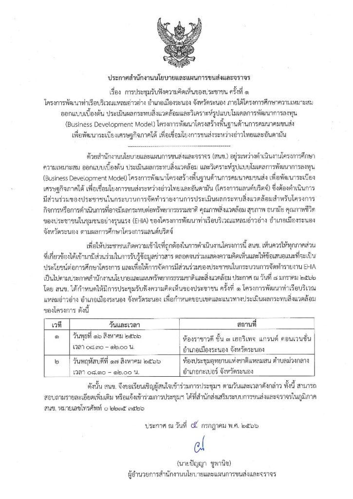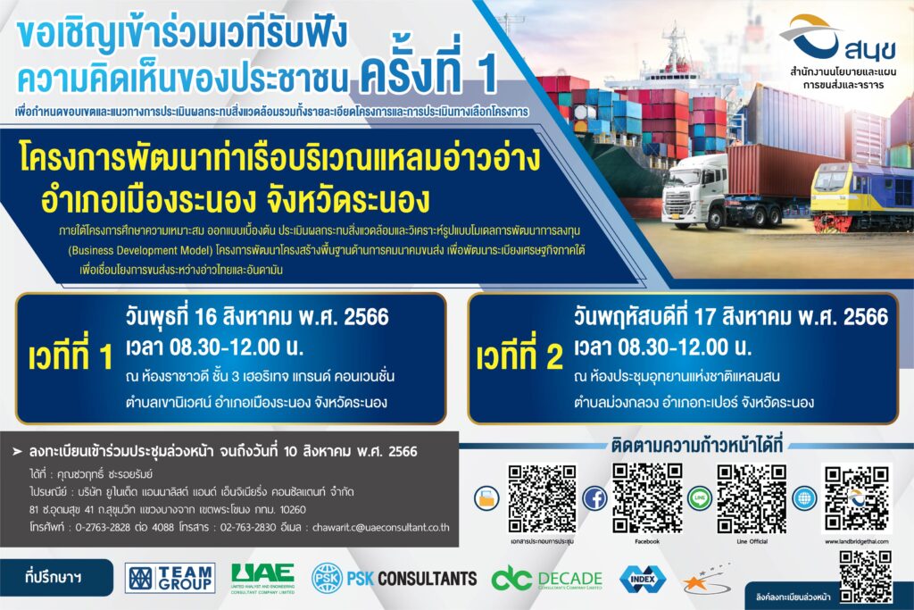 ขอเชิญเข้าร่วมเวทีรับฟังความคิดเห็นของประชาชนครั้งที่ 1 โครงการพัฒนาท่าเรือบริเวณแหลมอ่าวอ่าง อำเภอเมืองระนอง จังหวัดระนอง ภายใต้โครงการศึกษาความเหมาะสม ออกแบบเบื้องต้น ประเมินผลกระทบสิ่งแวดล้อมและ วิเคราะห์รูปแบบโมเดลการพัฒนาการลงทุน (Business Development Model) โครงการพัฒนาโครงสร้างพื้นฐานด้านการคมนาคมขนส่งเพื่อพัฒนาระเบียงเศรษฐกิจภาคใต้ เพื่อเชื่อมโยงการขนส่งระหว่างอ่าวไทยและอันดามัน